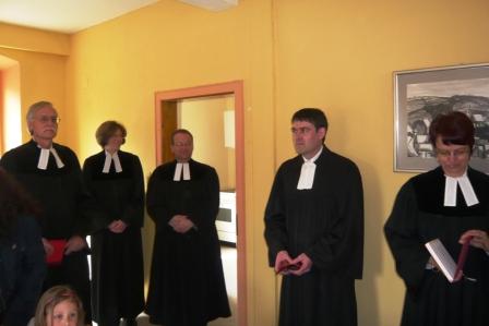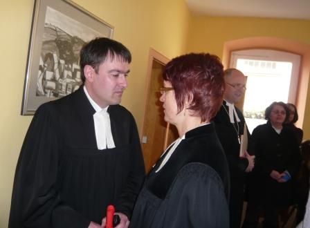 Pfr. Dr. Wolfgang Weich, Senior des Pfarrkapitels, verlas sodann die Installationsurkunde in Beamtendeutsch, dass der Pfarrerin zusätzlich zu ihrem bisherigen Einsatz auf der Pfarrstelle Zell im Umfang eines halben Dienstverhältnisses die Stelle mit allgemeinkirchlichen Aufgaben zur Dienstleistung in dieser Kirchengemeinde im Umfang von 25% eines vollen Dienstverhältnisses mit Wirkung vom 1. Januar 2012 übertragen worden sei, - im Klartext: Frau Ebert-Schewe hat nun dort eine dreiviertel Stelle inne.