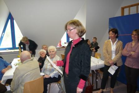 Das angekündigte Beisammensein mit Grußworten schloss sich an: Landessynodalin Renate Käser griff das Spiel „Stadt – Land – Fluss“ auf: Die Pfarrerin komme aus einer dynamischen Schweinfurter Stadtgemeinde (der Christuskirche) in drei tatkräftige Landgemeinden. Das Land stehe auch im Blick der Landeskirche als einer Flächenkirche. Und mit dem Fluss meinte Frau Käser natürlich den Main, den nun die Pfarrerin gegen einen Bach im Zeller Grund eingetauscht habe.