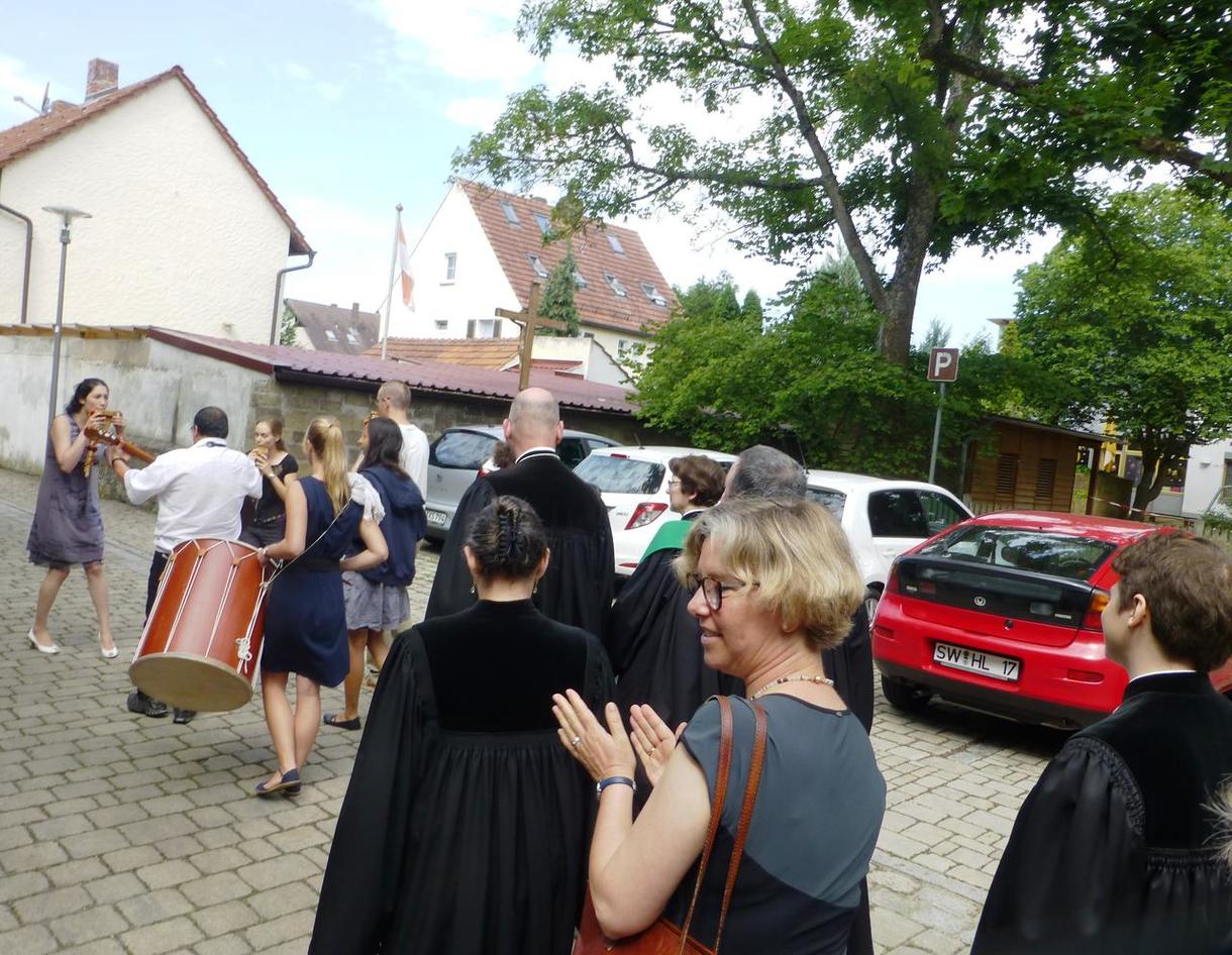 Dann zählte sie persönliche Erinnerungen an so vieles, was sich im Gemeindeleben abgespielt hatte, auf, erwähnte etwa das neue Gemeindehaus, KV-Sitzungen, ökumenische Gottesdienste, gemeinsame Ausflüge, die „Gespräche am Kamin“. Überall da sei Gott gegenwärtig gewesen, was nun auch für ihre Zukunft gelte. Darum nehme sie dieses Lied im Gepäck mit. Noch einmal aktivierte sie die Gemeinde, indem sie dazu aufforderte, jedem Banknachbarn „Gott ist gegenwärtig“ zuzusprechen.