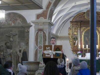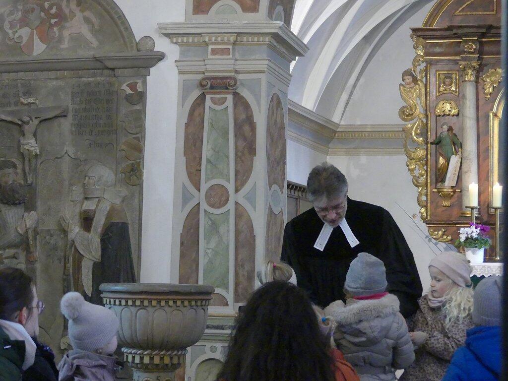 Gleich zu Beginn überreichten die Kinder der evangelischen Kindertagesstätte nach einem kleinen Ständchen einen Fußabstreifer mit dem Aufdruck „Gott schütze dieses Haus“ und dankten für die regelmäßigen Besuche. Dekan Oliver Bruckmann nutzte die Gelegenheit, um die Leiterin Aurelia Wagner, für 40 Jahre Dienst zu ehren und ihr Urkunde und ein Geschenk zu überreichen.