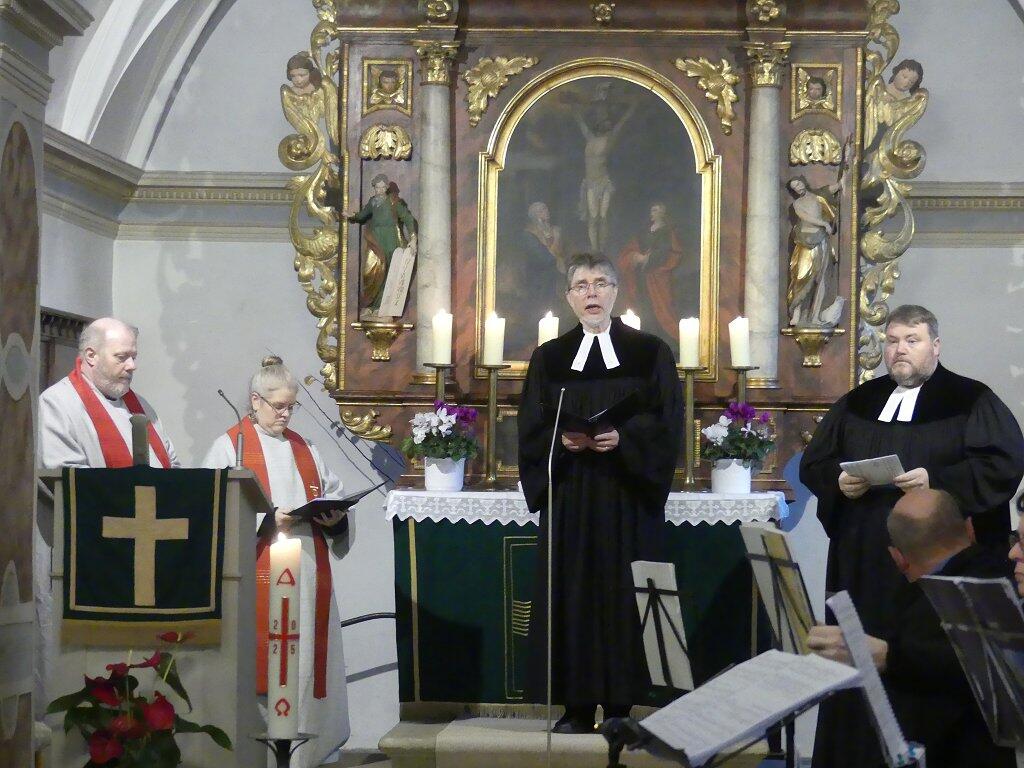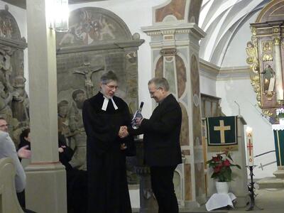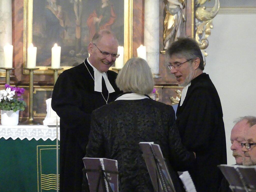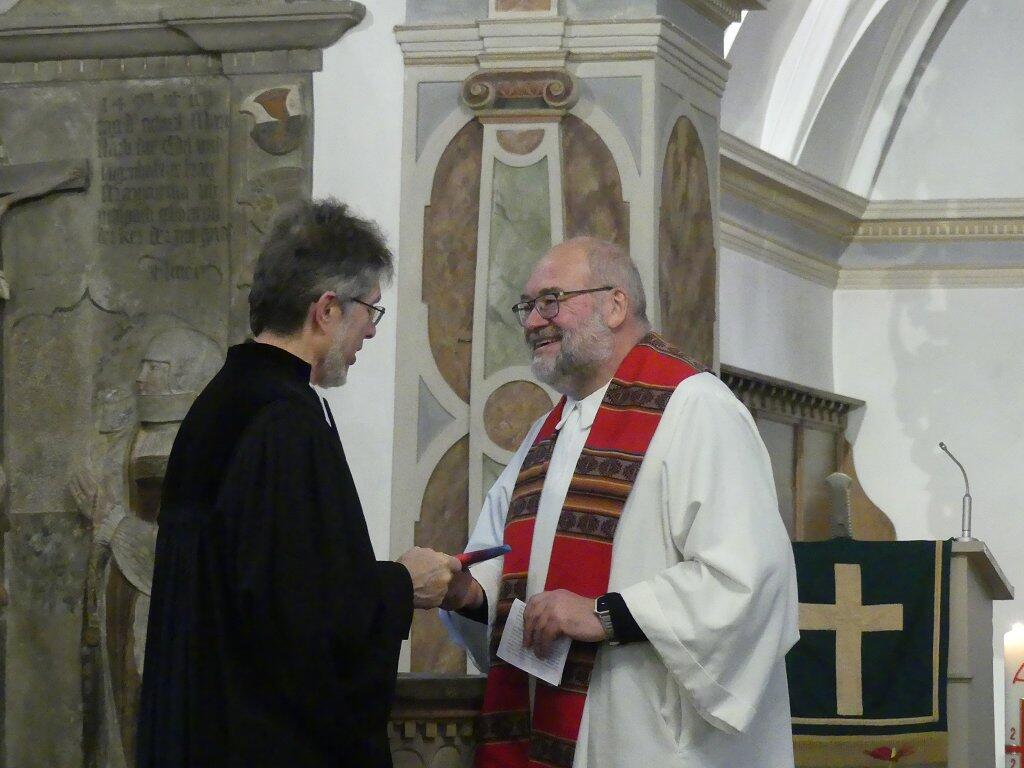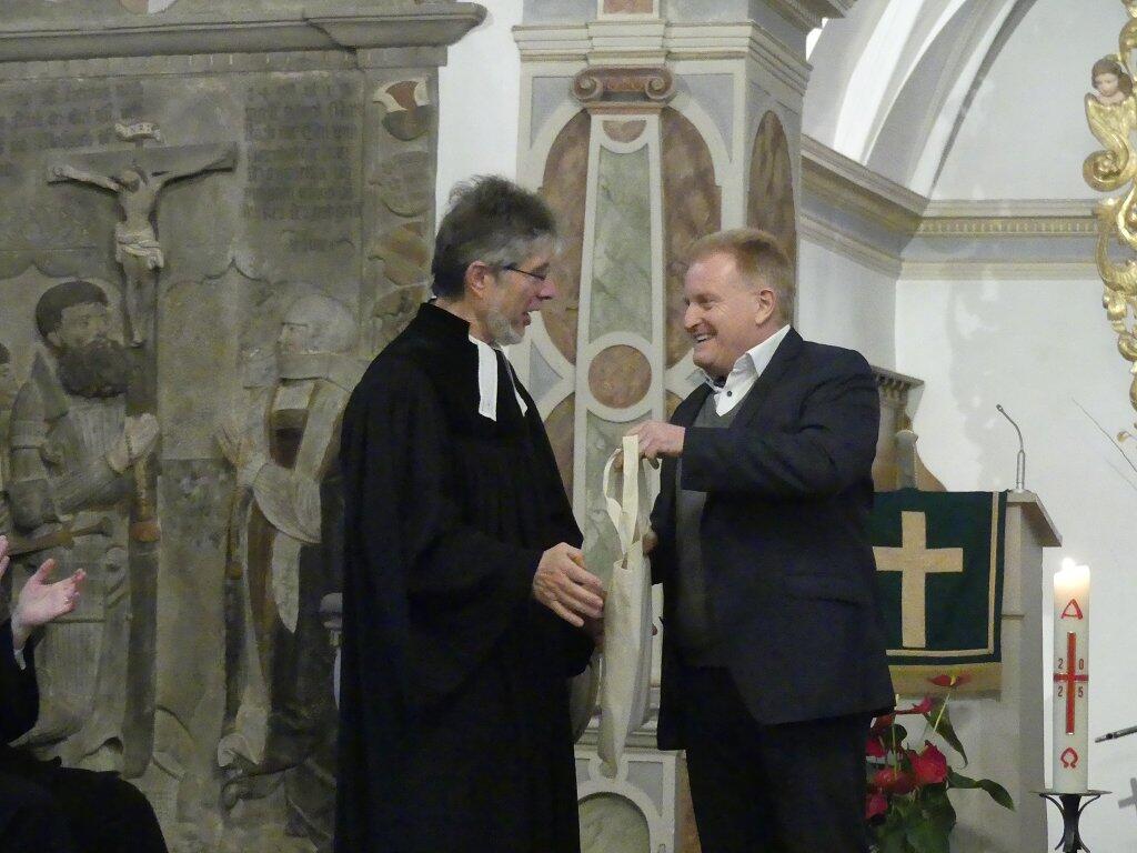 Nach einem Abschiedslied des gemeinsamen Kirchenvorstands bedankte sich der katholische Kollege Peter Rüb für die Zusammenarbeit in den letzten sieben Jahren. „Es war immer eine Freude, wir konnten uns gegenseitig die Bälle zuwerfen“.