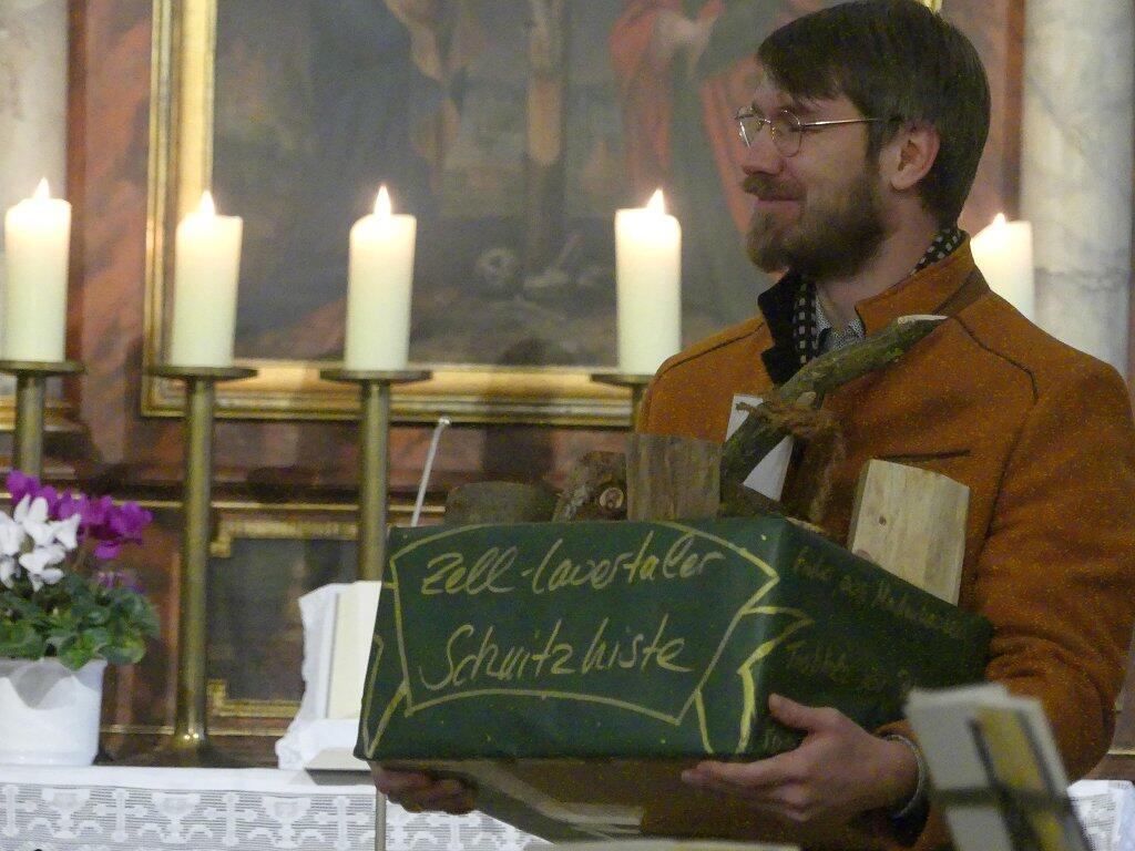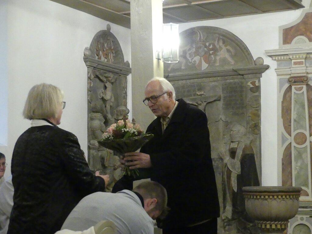 Eine „Schnitzkiste“ mit Hölzern aus allen Gemeinden der Pfarrei und aus aller Welt bietet ihm nun Material für sein Hobby. Dazu kommen junge Bäume für den neuen Garten in Schweinfurt. Auch Barbara Bonawitz erhielt einen großen Blumenstrauß.